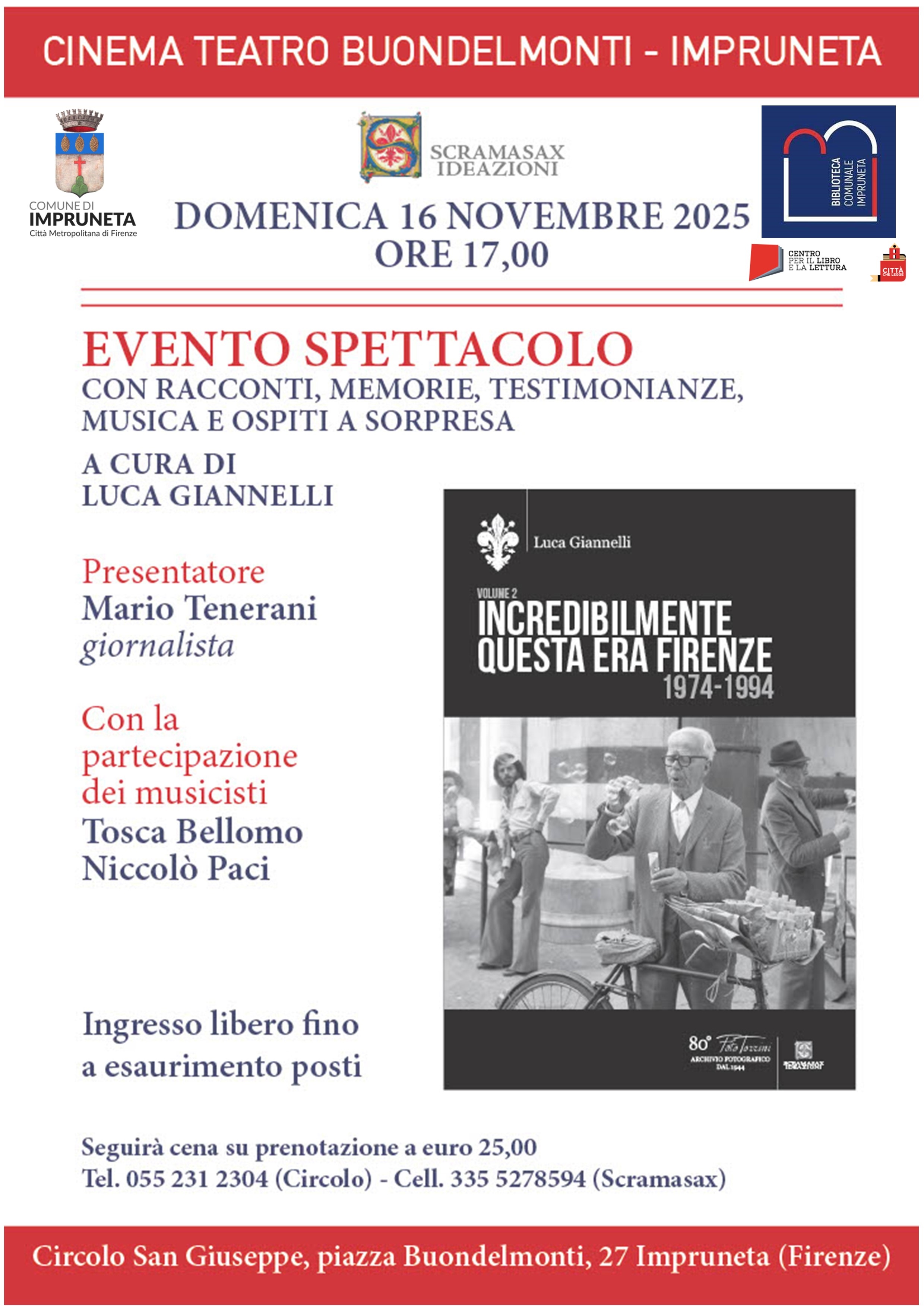Domenica 16 novembre alle ore 17:00, a Impruneta, presso il Cinema Teatro Buondelmonti (Piazza Buondelmonti 27), si terrà la presentazione del libro “Incredibilmente questa era Firenze 1974-1994” – volume 2 di Luca Giannelli (casa editrice Scramasax Ideazioni).