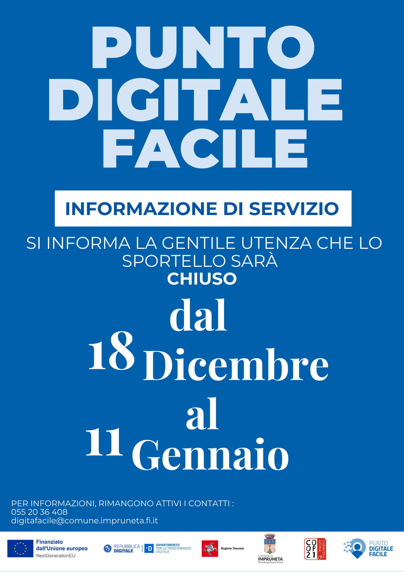 Il Comune di Impruneta rende noto che lo sportello del Punto Digitale Facile sarà temporaneamente chiuso al pubblico dal 18 dicembre 2025 all’11 gennaio 2026 compresi. Durante il periodo di sospensione dell’attività in presenza, resteranno disponibili i recapiti dedicati al supporto a distanza. Gli utenti potranno utilizzare i contatti operativi per richieste di assistenza e informazioni sui servizi digitali.