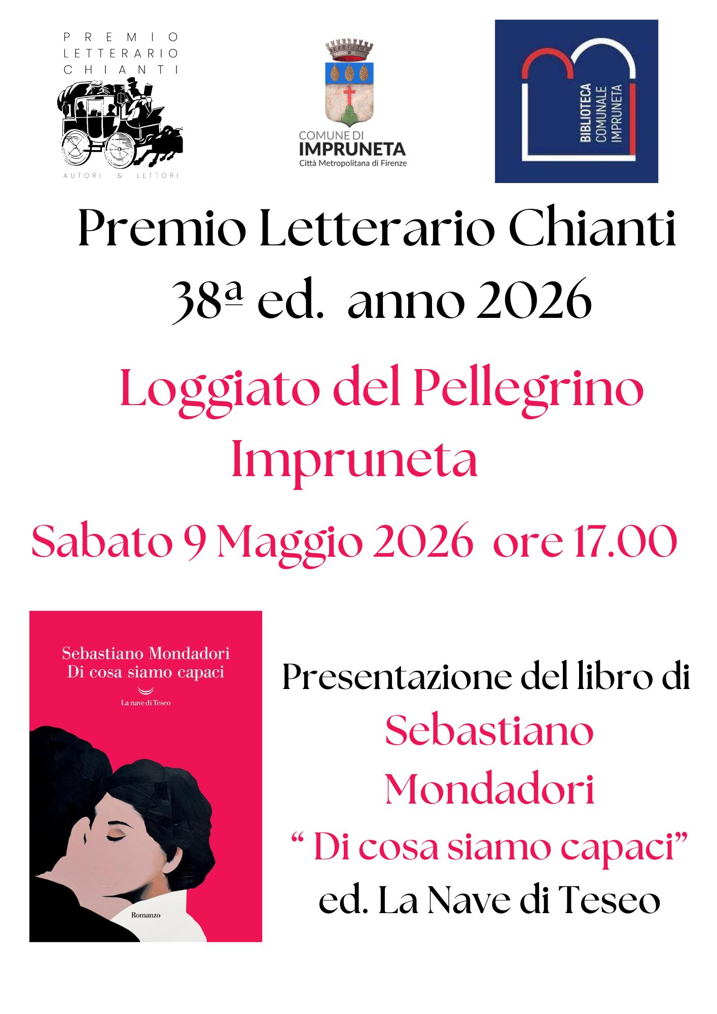 Sabato 9 maggio 2026 alle ore 17:00, il Loggiato del Pellegrino di Impruneta ospiterà Sebastiano Mondadori, uno dei quattro finalisti della 38ª edizione del Premio Letterario Chianti con il romanzo "Di cosa siamo capaci", La Nave di Teseo editore.